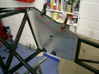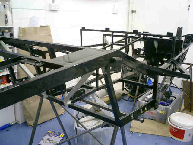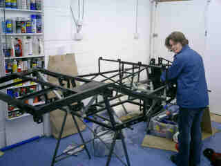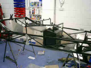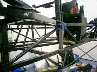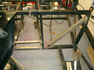 I also welded in the short upright you see here. The large round tube just above it is the front hoop of the roll cage. Presumably if the worst does happen and you roll the car, the loads through the front hoop of the roll cage will go down to where the two diagonals meet. Now the rather slender triangles the two diagonals form might be enough to stop the chassis simply folding in two at this point. But then again, if it is, why does Tim's car have them? For the sake of 6 inches of 1 inch ERW, it seemed worth adding them. I didn't bother on the passenger side. For one thing, it's a racecar and so is only supposed to have one person in it. Anyway, I'd run out of 1 inch square ERW... |