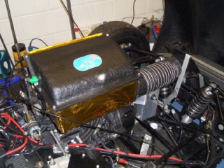 with tyre/bonnet clearance. Once the holes cut for the Aerocatches and the wheelarch was trimmed I could give the bonnet a quick once-over with some more matt black cellulose, and cover up all the primer over the new air duct in the nose. The paint's a bit stripey, since I did it with a little touch-up gun which has a very small paint fan shape. Still, 'tis only a racer... |