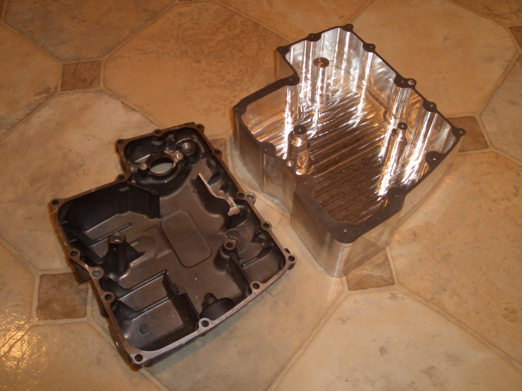 And here's one of the billet sumps, as delivered, alongside a largely-standard factory sump. The billet sumps are
